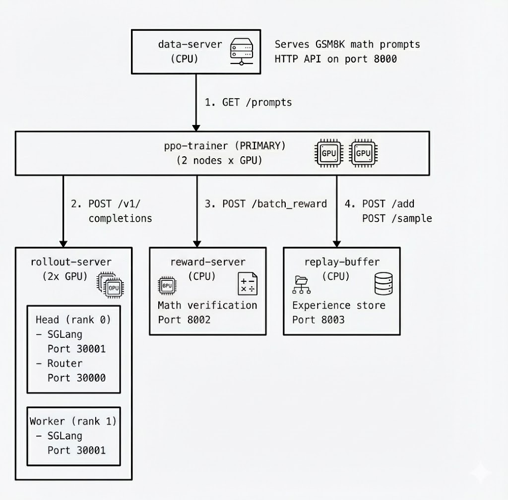 Example: RL post-training architecture where each component (ppo-trainer, rollout-server, reward-server, replay-buffer, data-server) runs as a separate task within a single Job Group. Tasks can have different resource requirements and communicate via service discovery.#