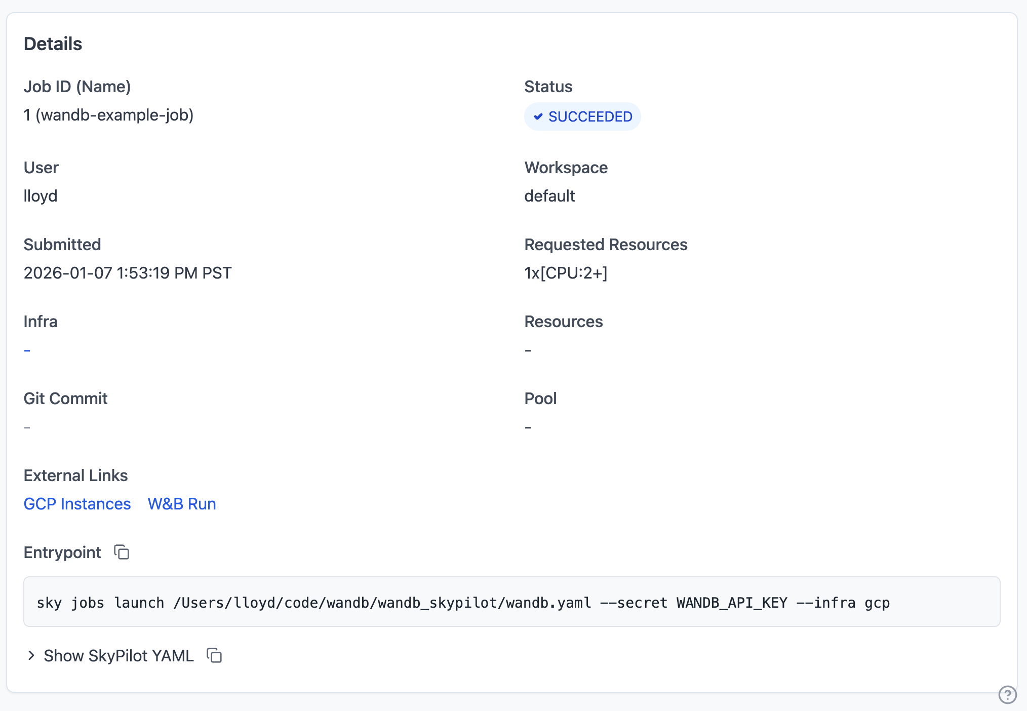 When using W&B for experiment tracking, the W&B library automatically prints the run URL to stdout when you initialize a run. SkyPilot detects this and displays it in the dashboard.