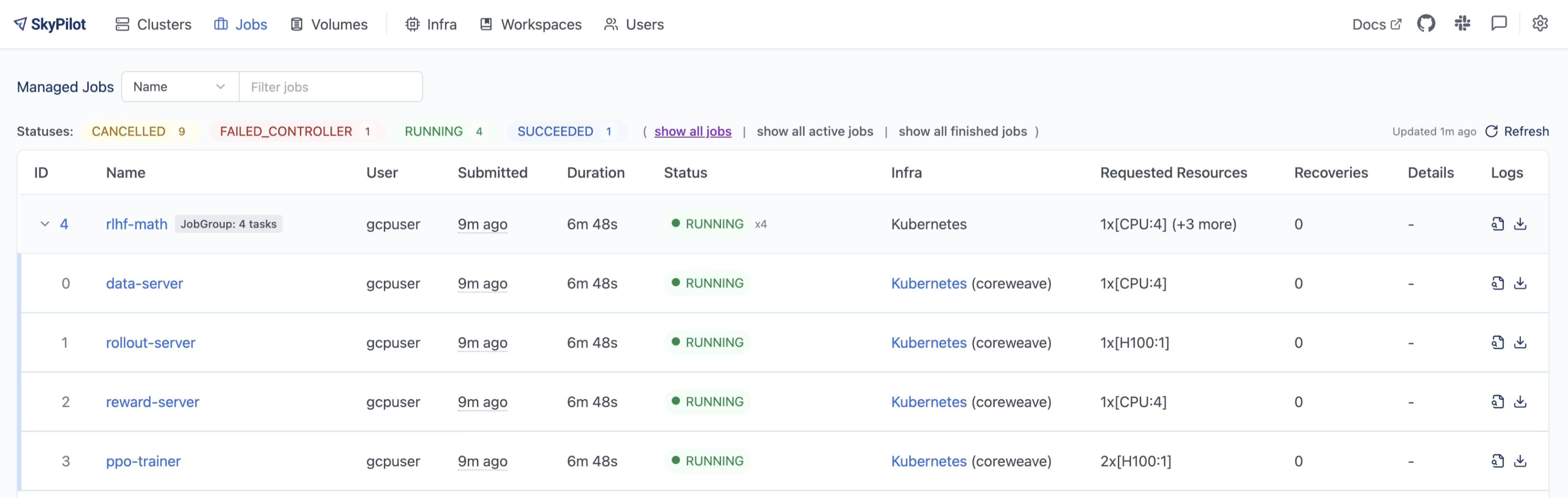 A Job Group with 4 tasks (data-server, rollout-server, reward-server, ppo-trainer) running in parallel on Kubernetes. Each task has different resource requirements and can be monitored independently through the dashboard.#