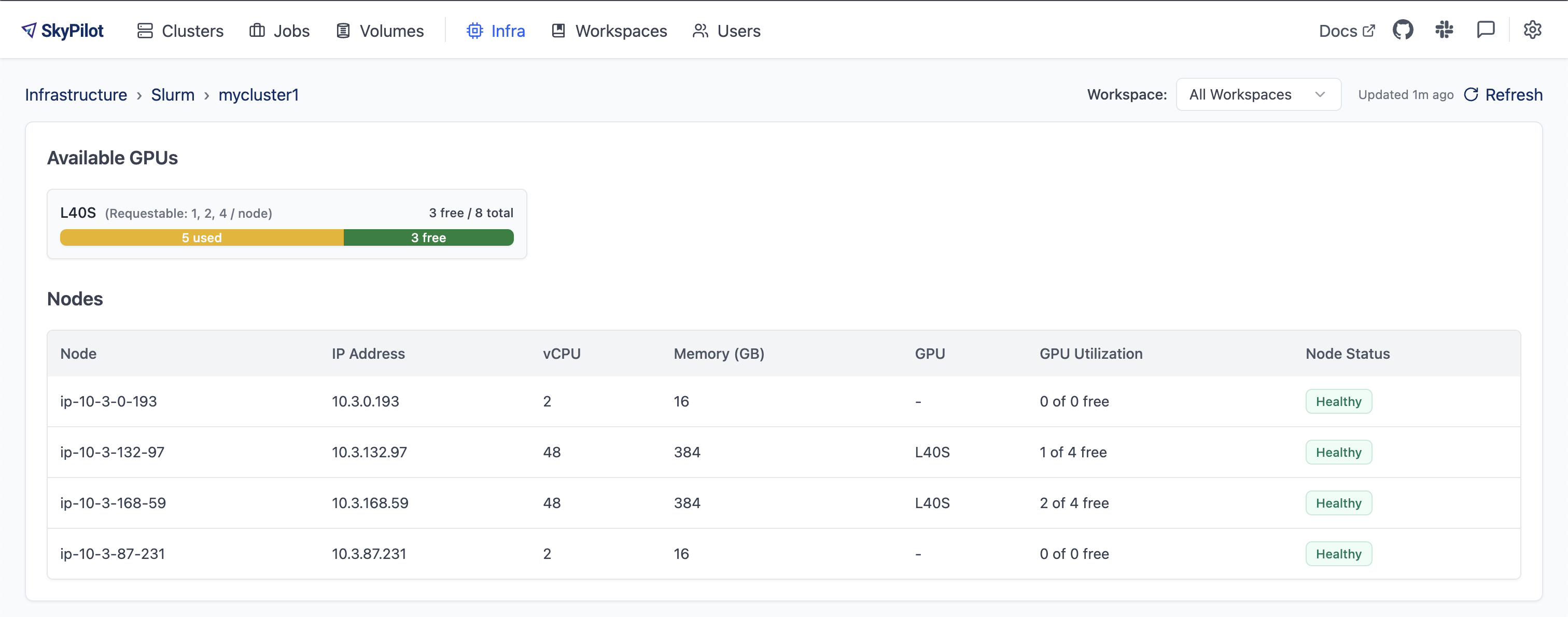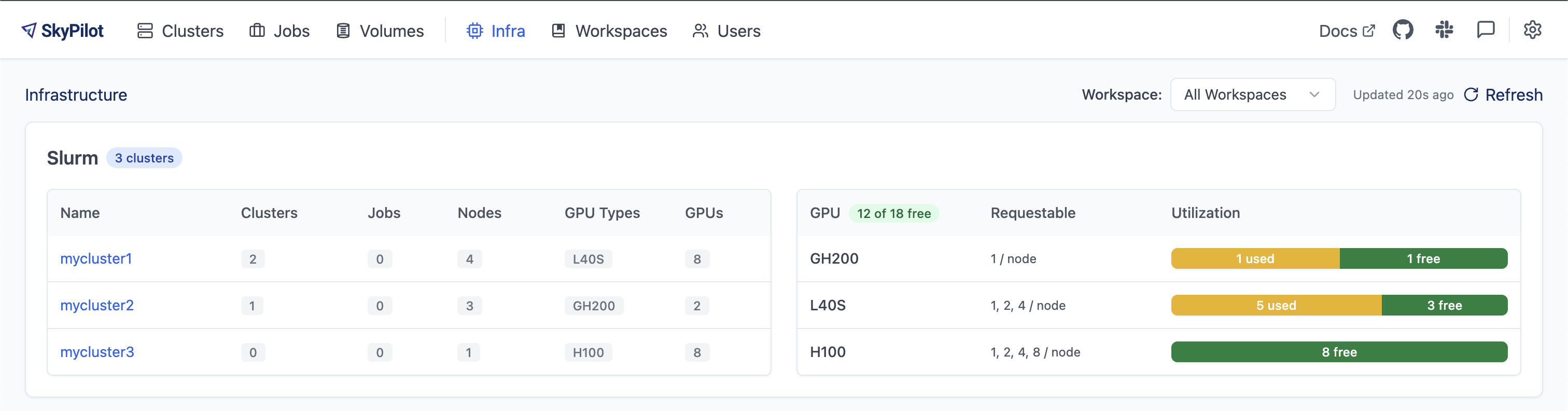 SkyPilot provides a unified dashboard to monitor GPU availability and utilization across all your Slurm clusters.